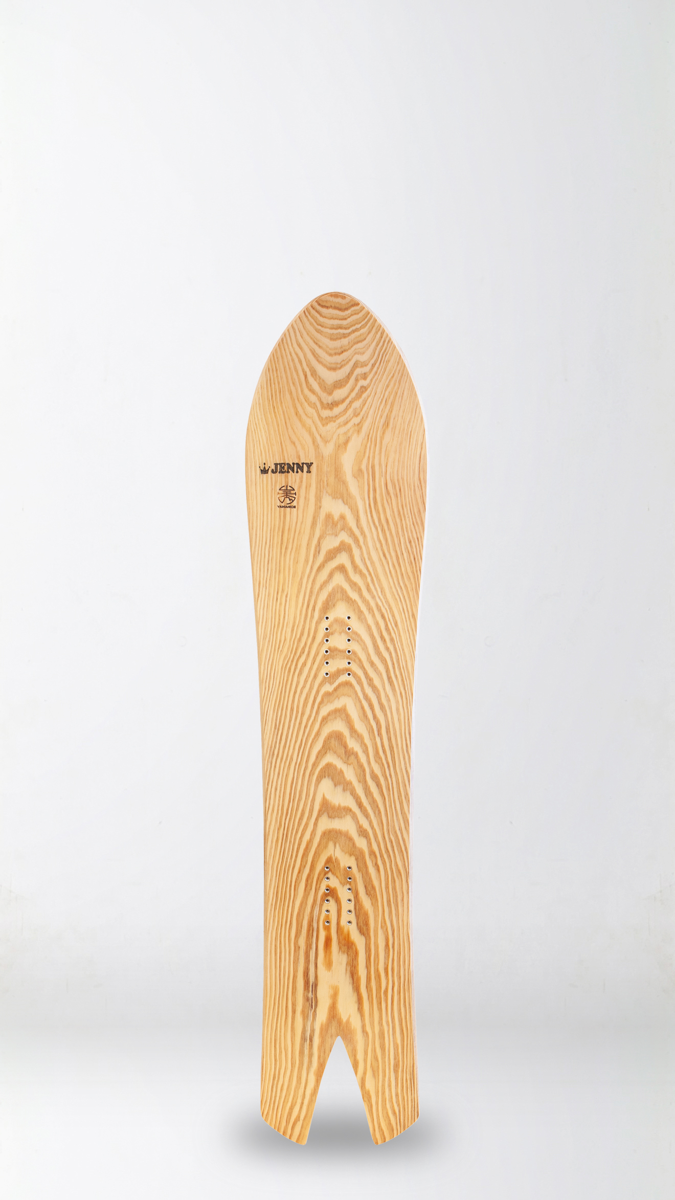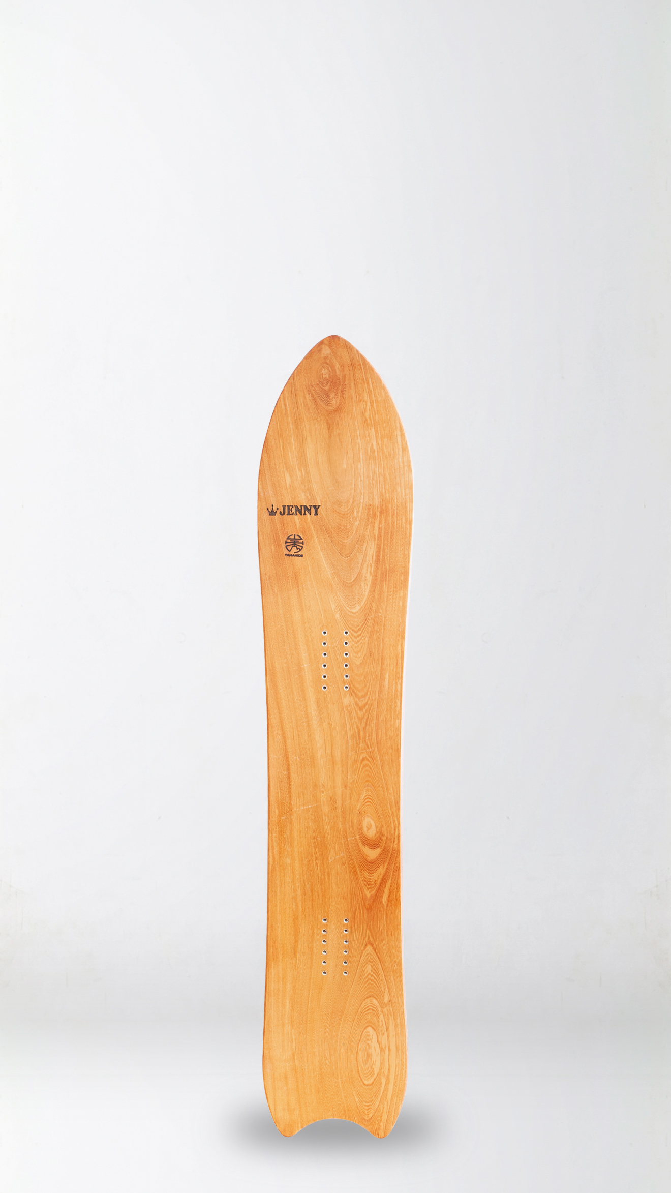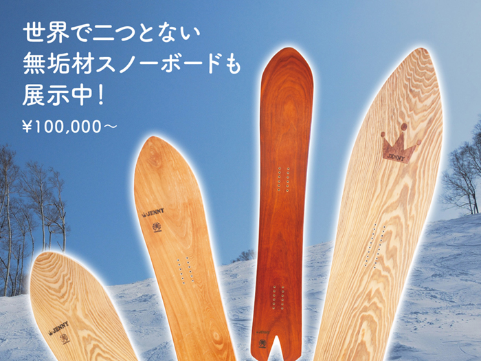 砺波のボードショップ「JENNY」さんとのコラボレーションで実現した無垢一枚板のスノーボードも展示中。