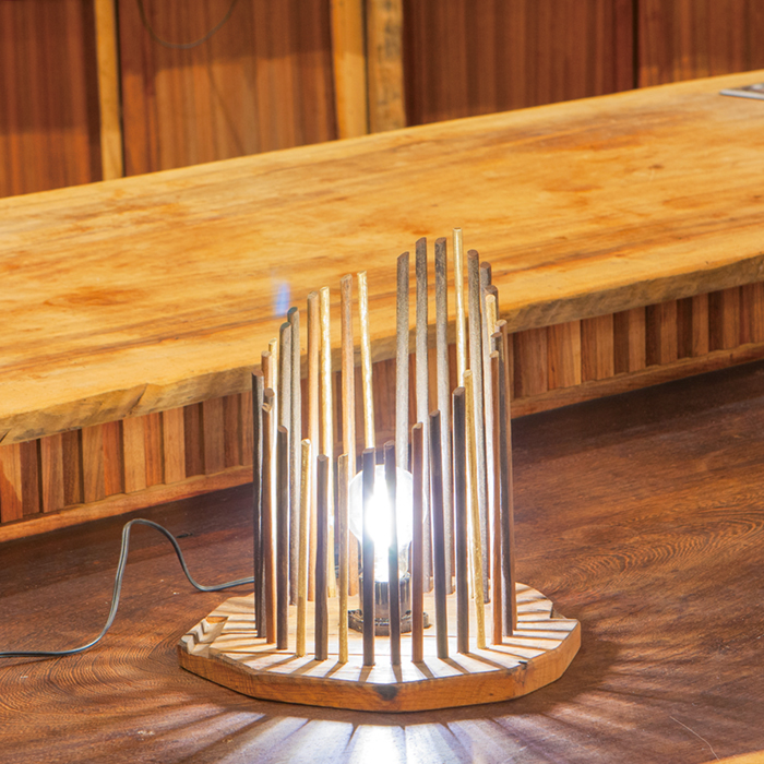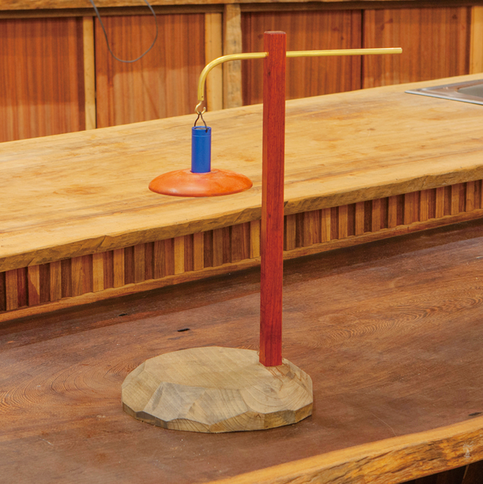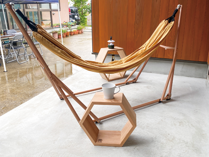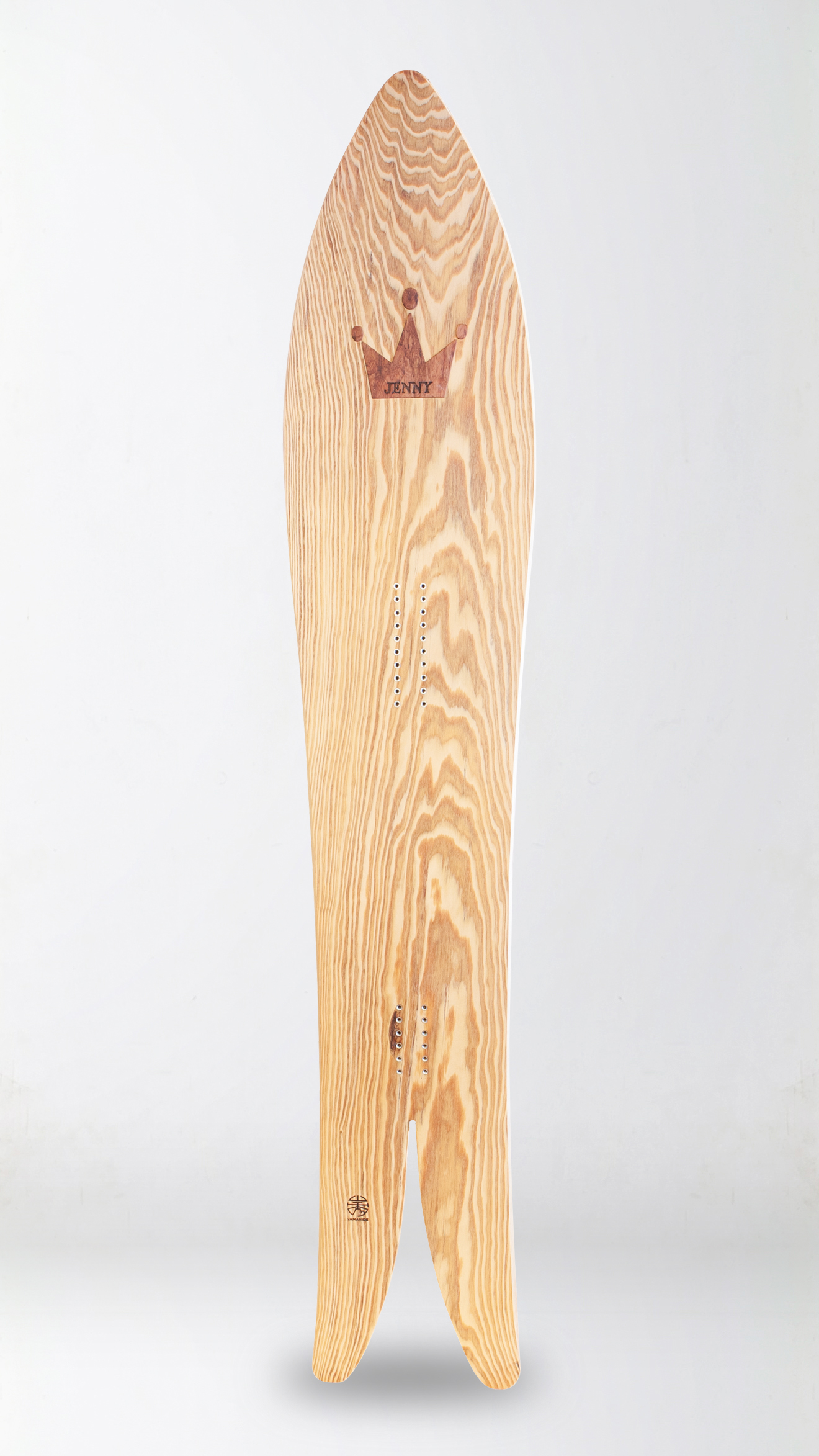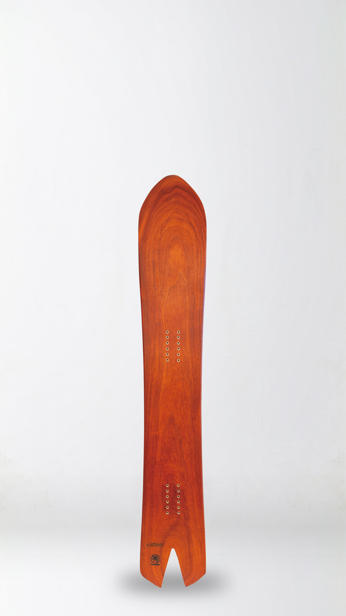 砺波のボードショップ「JENNY」さんとのコラボレーションで実現した無垢一枚板のスノーボードも展示中。