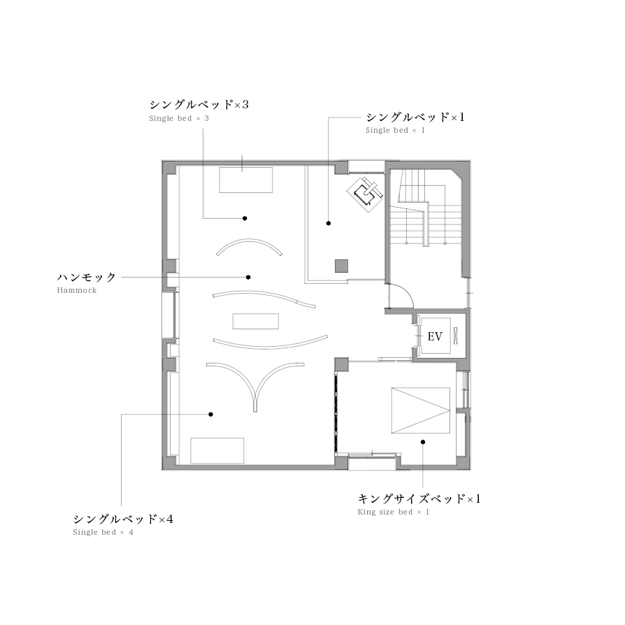最大10名が宿泊可能なワンフロアのベッドルーム。